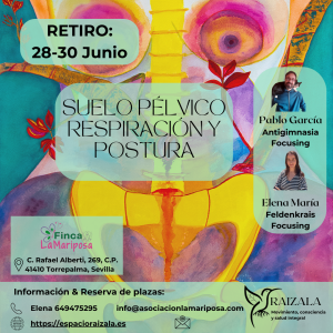 En este retiro exploraremos nuestro suelo pélvico y sus relaciones con nuestra respiración y postura, desde una perspectiva que integra la autoconsciencia a través del movimiento del método Feldenkrais, el trabajo preciso sobre las cadenas musculares de la Antigimnasia y el enfoque corporal de Eugene Gendlin. Esta original integración nos permite, de una manera amable, delicada y eficaz, poner luz sobre nuestro suelo pélvico: su localización, su estructura, sus funciones y sus relaciones con el resto de nuestro cuerpo, a través la exploración vivencial de propuestas sencillas pero muy precisas y profundas. Una oportunidad para cuidarte e iniciar una nueva relación con tu cuerpo a través de esta sinergia entre tres enfoques revolucionarios de lo corporal.